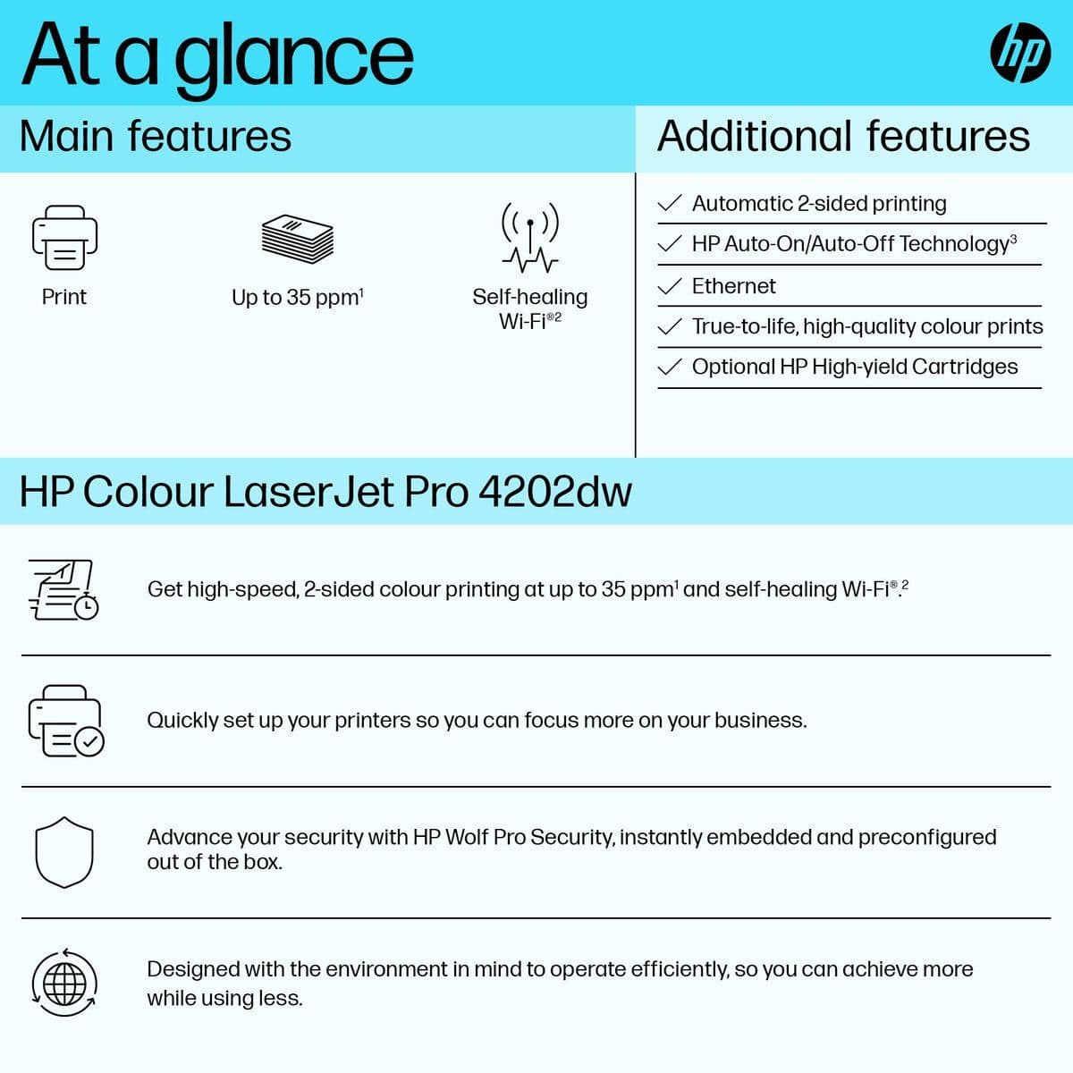 | Product Description | HP Color LaserJet Pro 4202dw - printer - colour - laser |